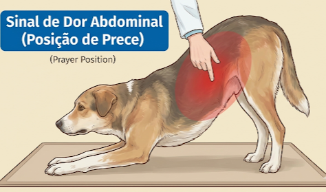 2. Abdômen Agudo (Posição de Prece): O cão estica as patas da frente no chão e levanta o bumbum para cima (como se estivesse a espreguiçar-se, mas fica parado assim). Isso indica dor abdominal intensa (pancreatite ou corpo estranho).