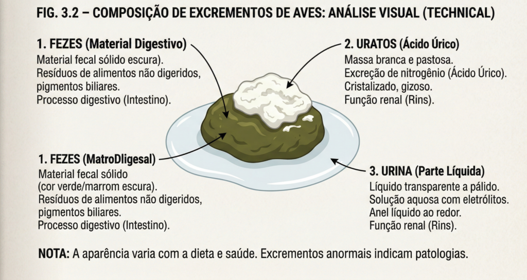 Fezes (Sólida): A porção em forma de “cobrinha”, geralmente verde-escura ou marrom (dependendo se a ave come ração extrusada ou sementes). Vem do intestino.