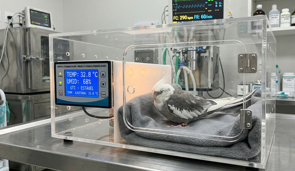 Em casos críticos, a primeira atitude do clínico não é fazer exames de sangue, mas sim estabilizar a ave numa incubadora com oxigênio e calor controlado para reverter a hipotermia.