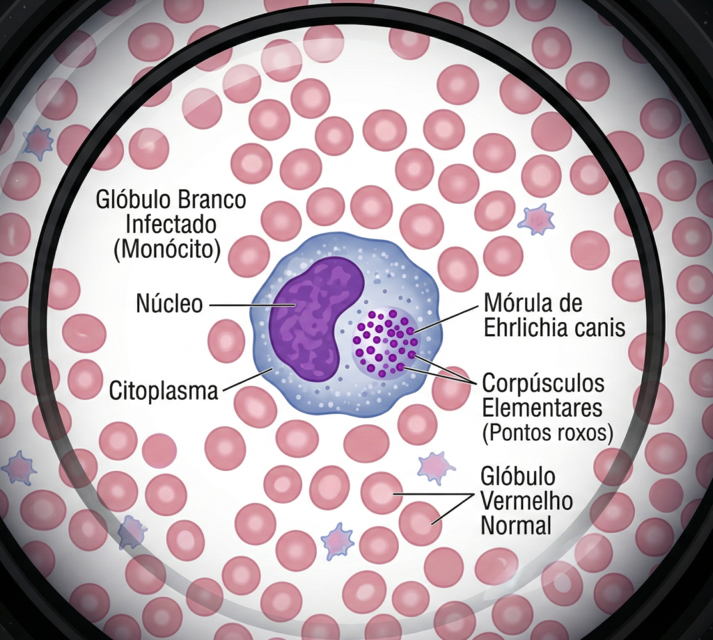 A Erliquiose é causada por uma bactéria intracelular obrigatória. Isso significa que ela não sobrevive solta no sangue; ela precisa invadir uma célula. E o alvo dela é audacioso: ela invade justamente os glóbulos brancos (monócitos e granulócitos), que são as células de defesa do cão.