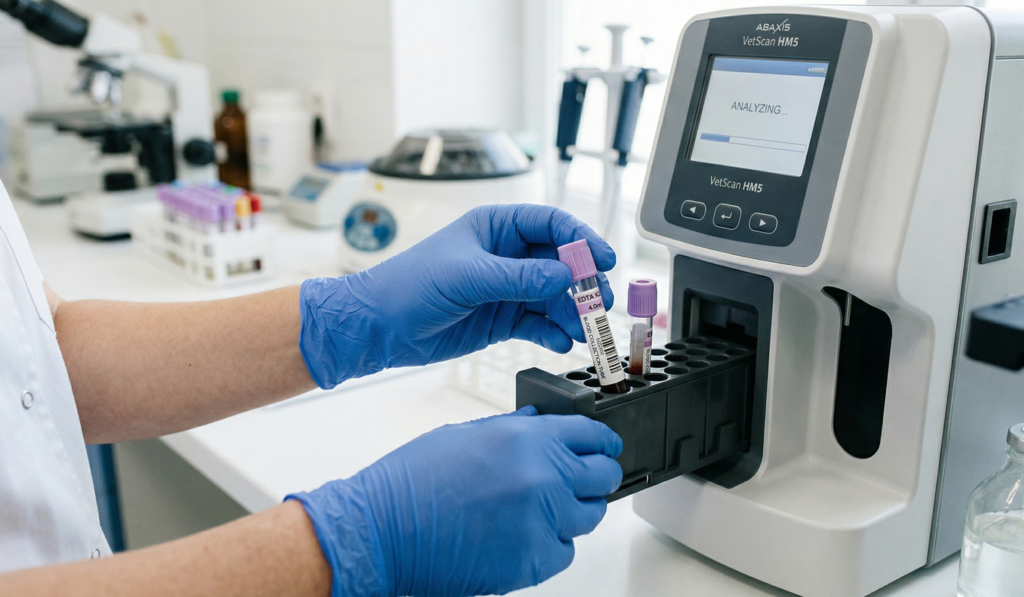 O Hemograma Completo: É a nossa principal bússola. Olhamos imediatamente para a contagem de plaquetas. Um cão normal tem entre 200.000 e 500.000 plaquetas. Num cão com Erliquiose aguda, esse número pode despencar para 20.000 ou menos.