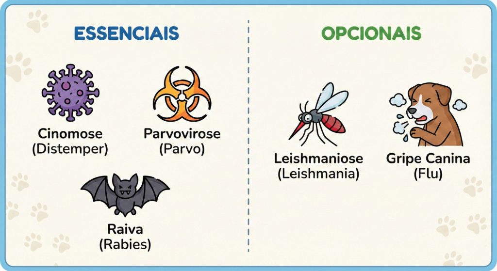 Estas são obrigatórias para qualquer cão, independentemente de viver num apartamento ou numa fazenda. Elas protegem contra doenças letais.