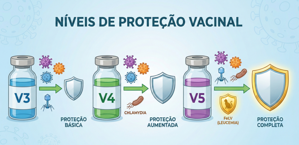 A base da vacinação em gatos são as vacinas polivalentes. A diferença numérica refere-se à quantidade de antígenos (doenças) que cada uma protege. Não existe “a melhor vacina”, existe a vacina certa para o perfil do seu gato.